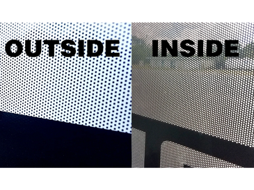Perforated vinyl window film provides full color graphics while blocking visibility from the out-facing side, while providing 50% visibility out from the back side of the material.